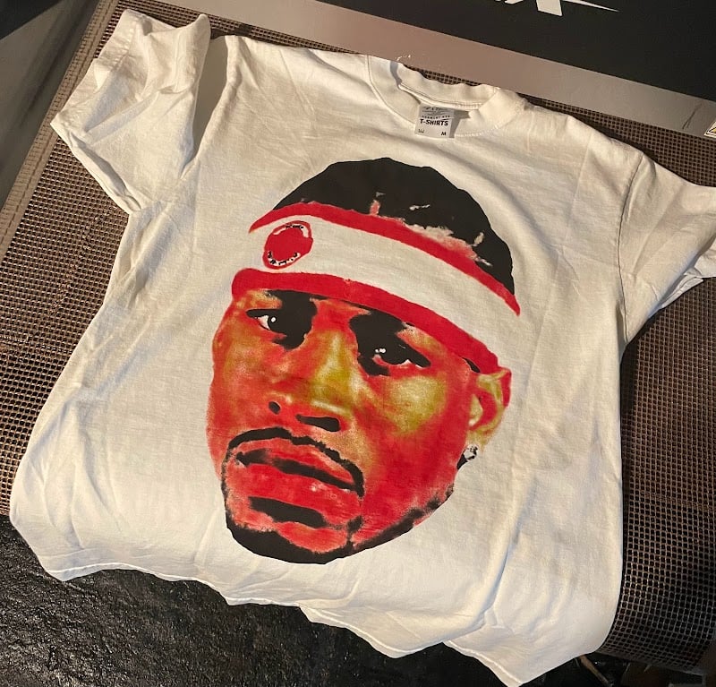 A white T-shirt featuring a large graphic print of a person's face is displayed on a textured surface. The shirt showcases vibrant colors, emphasizing the design.
