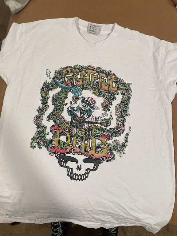 A white t-shirt featuring a colorful Grateful Dead design is laid flat on a surface. The graphic includes intricate illustrations of a skull and whimsical elements.