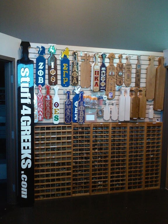 The image shows a wall display in a sewing store featuring various wooden paddles with Greek letters and symbols.