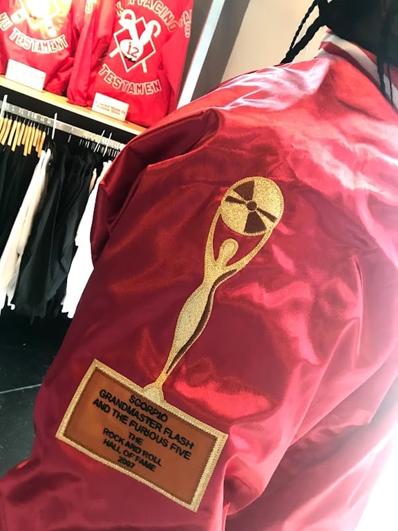 The image features a close-up of a red satin jacket with a gold emblem, showcasing a unique design.