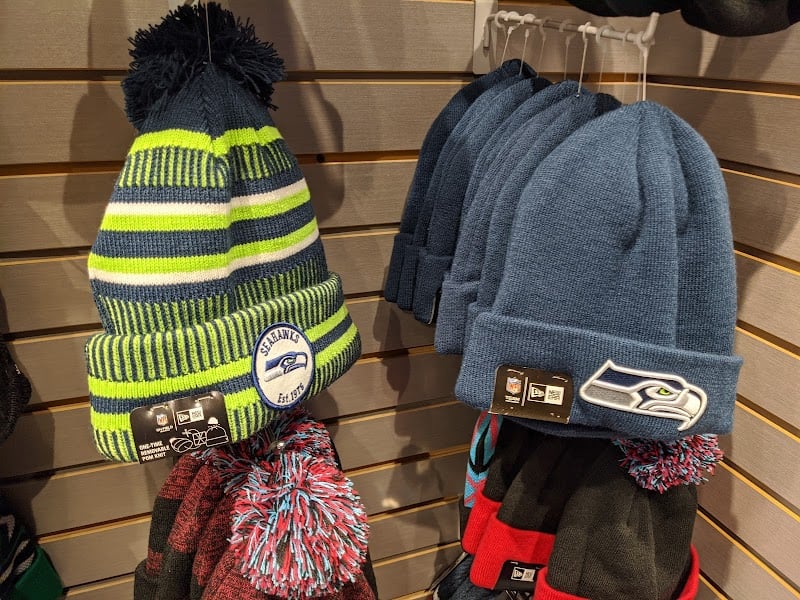 The image features a display of various knitted hats, including a striped Seattle Seahawks beanie with a pom-pom and solid blue beanies.