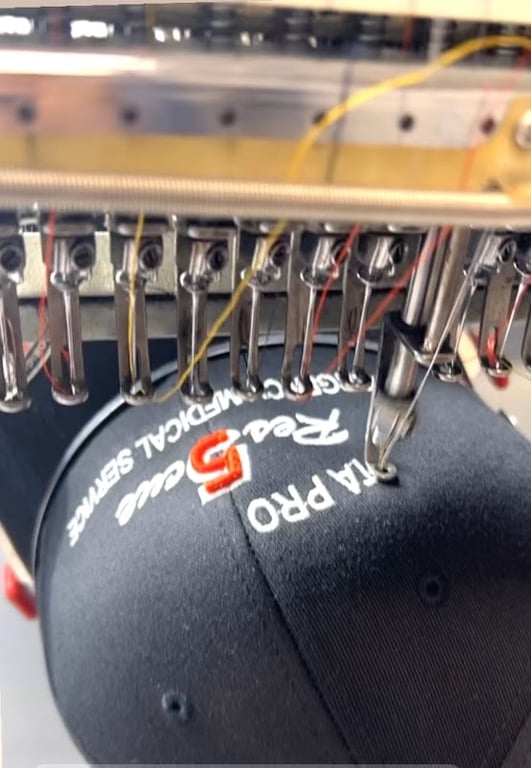 The image shows a close-up of an embroidery machine stitching a logo onto a black cap. Colorful threads are visible, highlighting the intricate details of the design.