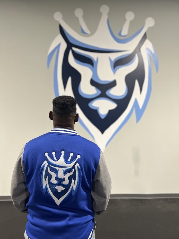 A person stands with their back to the camera, wearing a blue and gray varsity jacket featuring a lion logo.