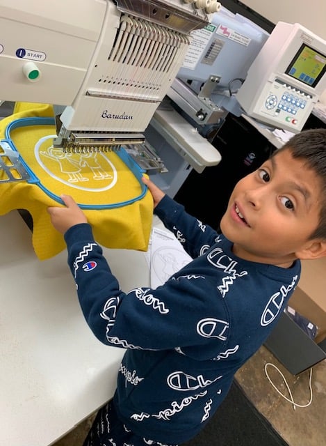 A young boy operates an embroidery machine in a sewing store, focusing on a bright yellow fabric hoop.