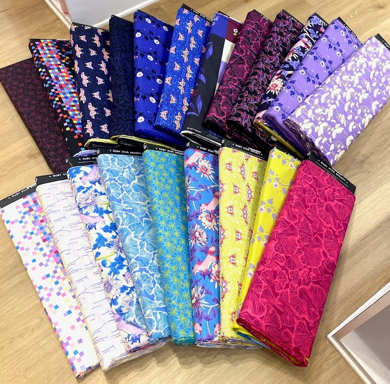 A vibrant display of various fabric rolls is showcased on a wooden surface at Stitched Gifts, a sewing store.