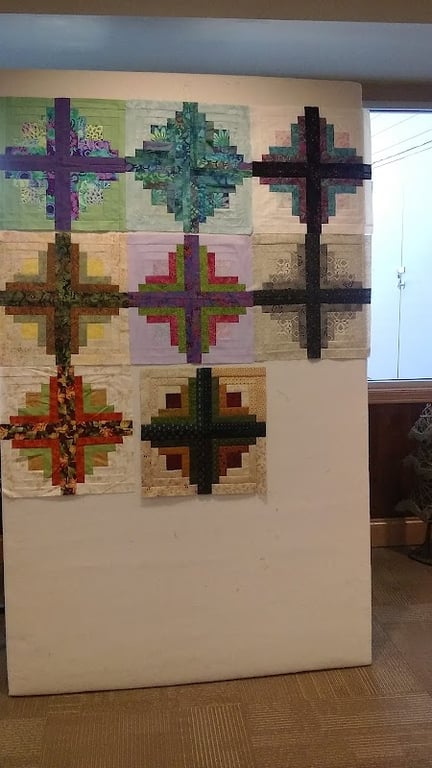The image showcases a display of colorful quilt blocks arranged in a cross pattern on a white wall in Tiny Stitches sewing store.