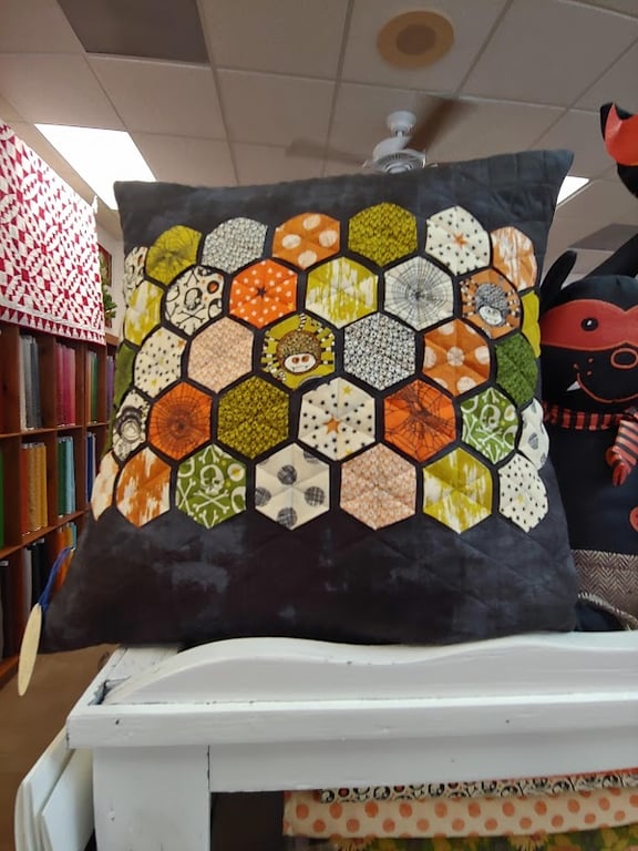 The image features a colorful hexagon-patterned pillow displayed prominently in a sewing store.