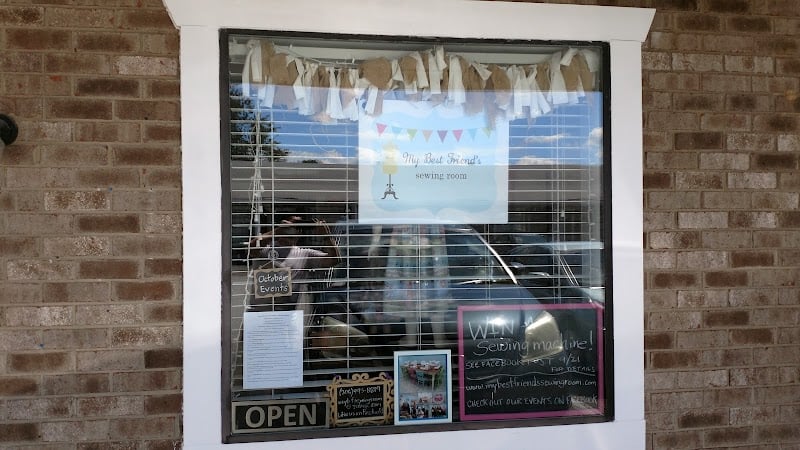 The image shows the storefront of My Best Friend's Sewing Room LLC, featuring a welcoming display with a sign, event announcements, and a decorative banner.