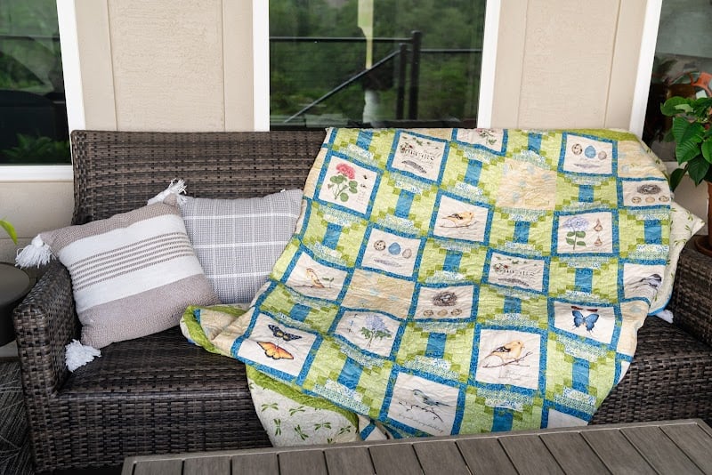 A cozy outdoor setting features a quilt draped over a wicker sofa, showcasing vibrant patterns of nature and wildlife.