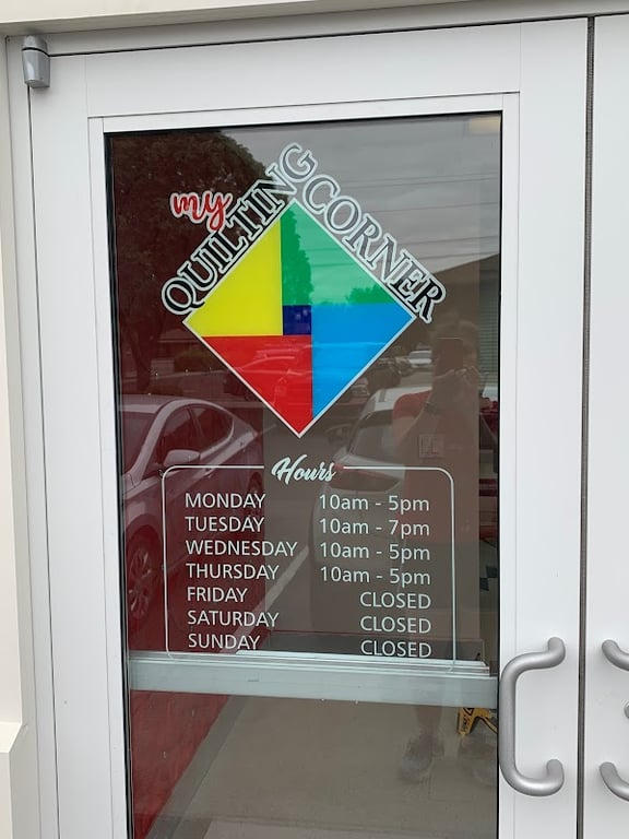 The image shows the entrance of My Quilting Corner, featuring a colorful sign with the store's name and hours of operation.