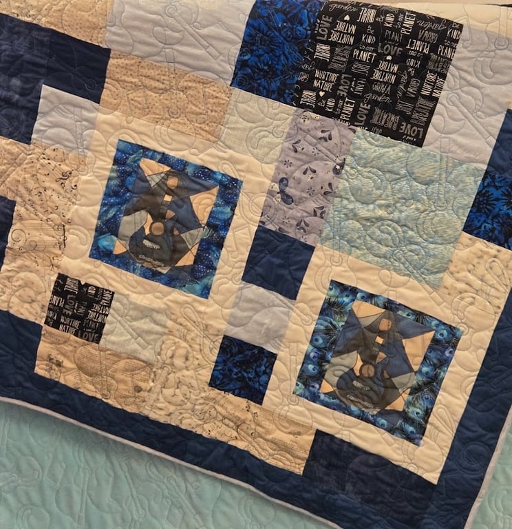 The image showcases a beautifully quilted blanket featuring a variety of blue and cream fabrics with intricate patterns.