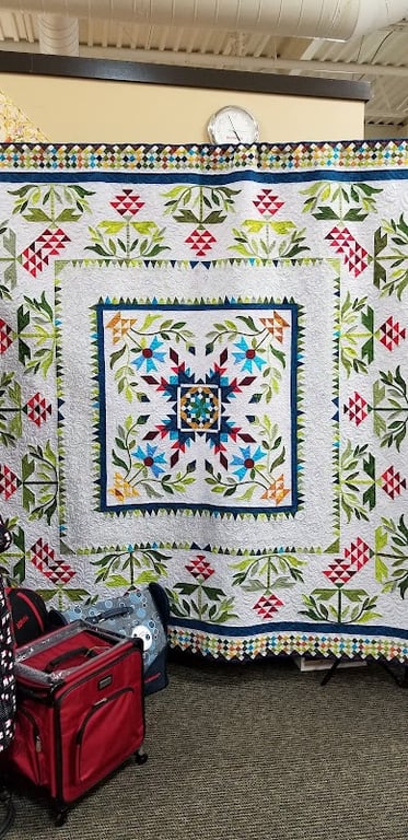 The image showcases a vibrant quilt displayed prominently in a sewing store, featuring intricate floral and geometric patterns.