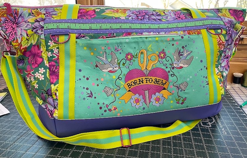 The image features a colorful sewing bag adorned with floral patterns and an embroidered design that reads "Born to Sew.
