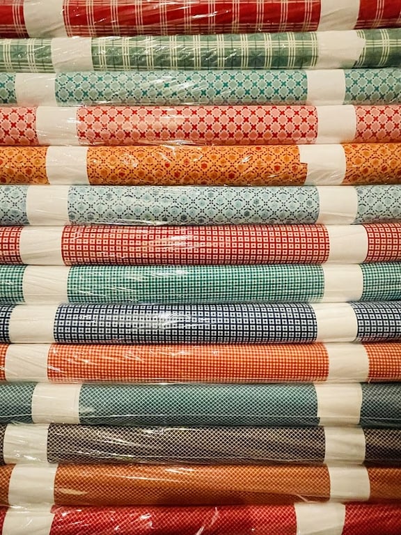 The image showcases neatly stacked rolls of colorful fabrics in a sewing store, featuring various patterns such as checks and florals.