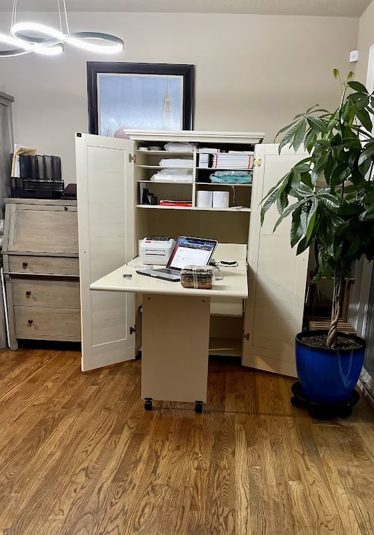 The image shows a cozy sewing store interior featuring a white sewing cabinet with open doors displaying neatly organized fabrics and supplies.