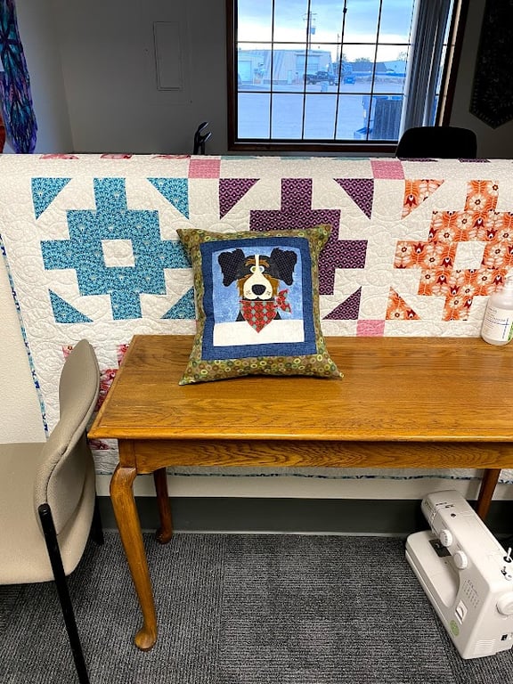 The image features a cozy sewing store interior with a wooden table displaying a decorative pillow featuring a dog design.