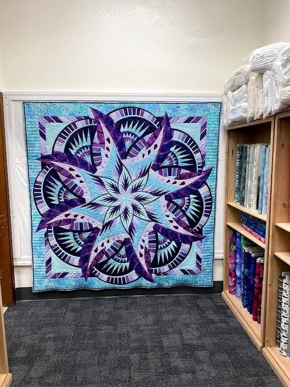 The image showcases a vibrant quilt featuring a starburst design in shades of blue and purple, displayed prominently on the wall of a sewing store.