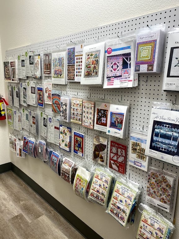 The image shows a well-organized display wall at Stitch n Giggles, featuring a variety of sewing patterns and quilting kits.