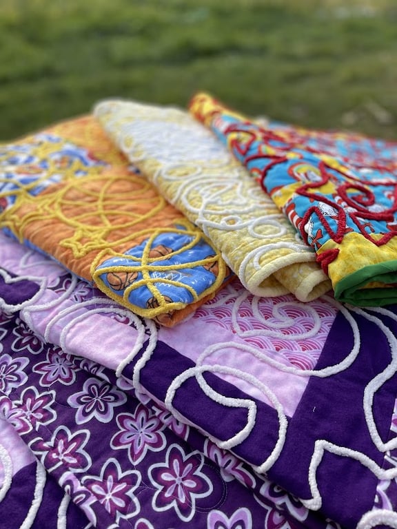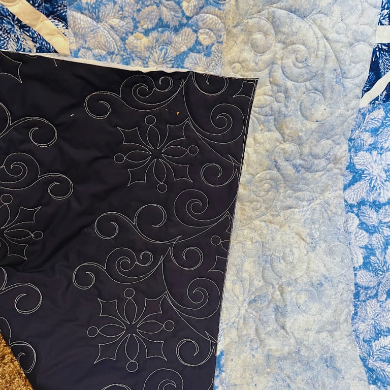 The image showcases a close-up of beautifully quilted fabric pieces, featuring intricate designs in dark blue and light blue tones.