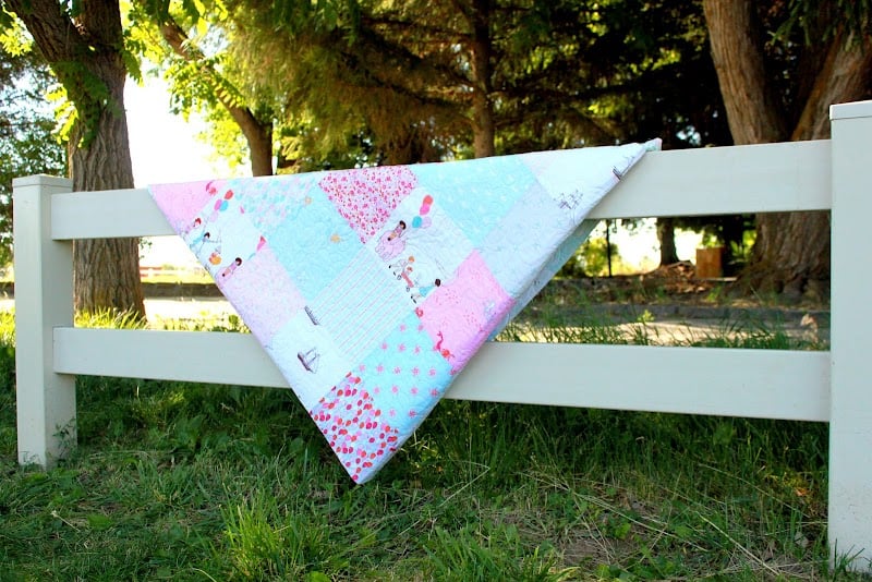 A colorful quilt hangs on a white fence, showcasing a patchwork of pastel fabrics with playful patterns.