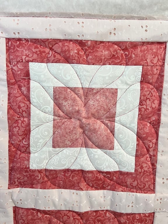The image showcases a beautifully quilted fabric piece featuring intricate patterns in shades of red and white.