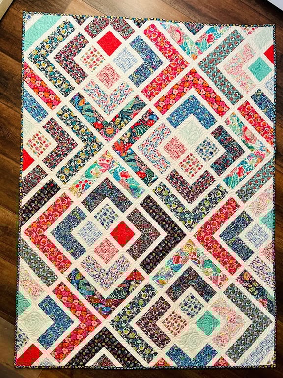 A vibrant quilt featuring a geometric pattern of colorful fabrics is displayed on a wooden floor.