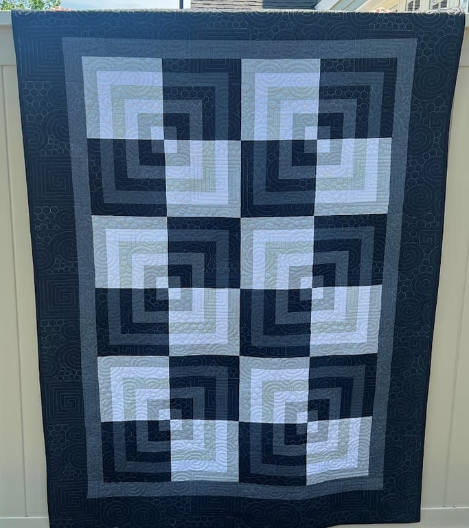 A beautifully crafted quilt hangs against a light background, featuring a geometric pattern of alternating dark and light squares.