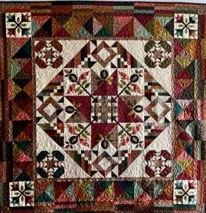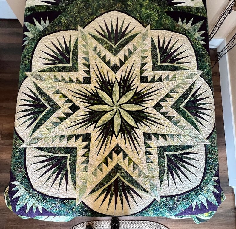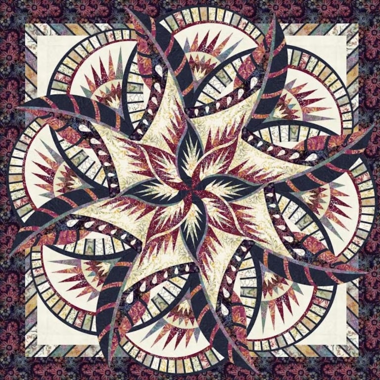 A vibrant quilt featuring intricate star and spiral patterns in rich colors of burgundy, cream, and navy is displayed prominently.