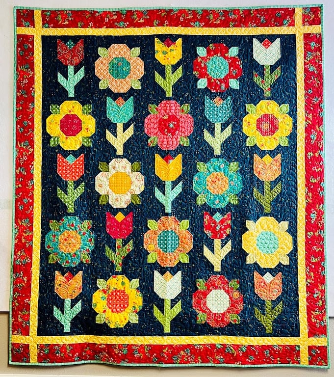 A vibrant quilt featuring colorful floral patterns is displayed prominently against a neutral wall in The Twisted Quilter sewing store.