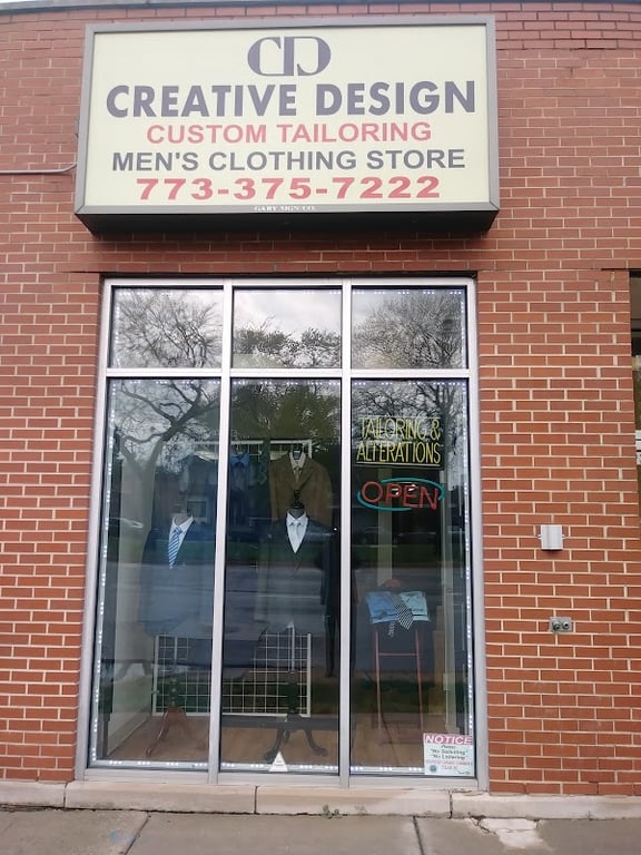 The image shows the storefront of Creative Design, a men's clothing store specializing in custom tailoring.