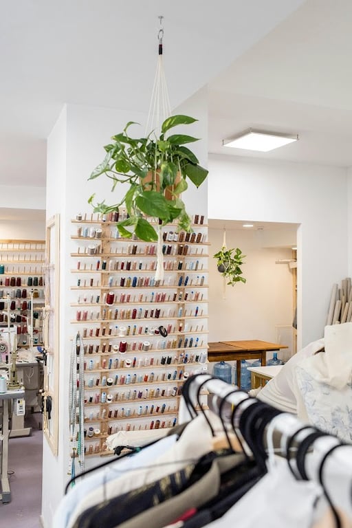 The image showcases the interior of Creative Design & Tailoring, featuring a wall of colorful sewing threads and a hanging plant.