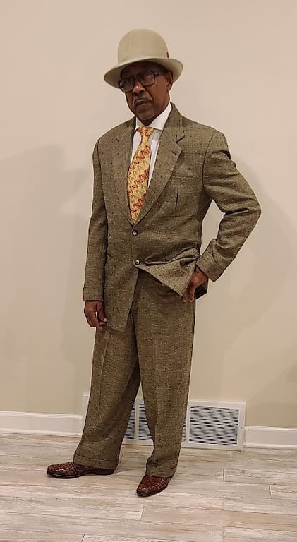 A man stands confidently in a stylish brown suit with a patterned tie and a light-colored hat. The background features a neutral wall, emphasizing his tailored outfit.