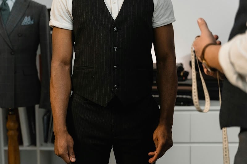 A tailor measures a client wearing a stylish vest in a sewing store. The interior features neatly arranged suits on display and sewing tools, creating a professional atmosphere.