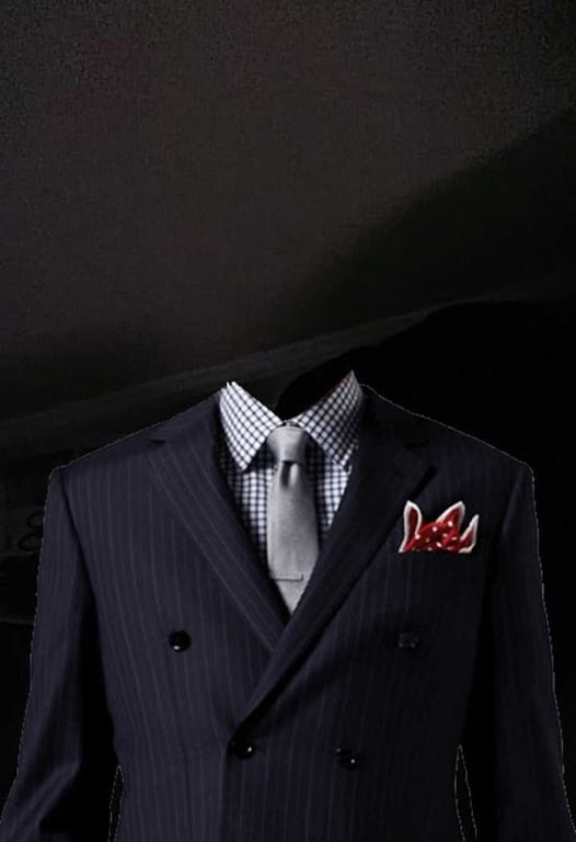 The image features a stylish, headless mannequin dressed in a tailored dark pinstripe suit with a checkered shirt and a red polka dot pocket square.