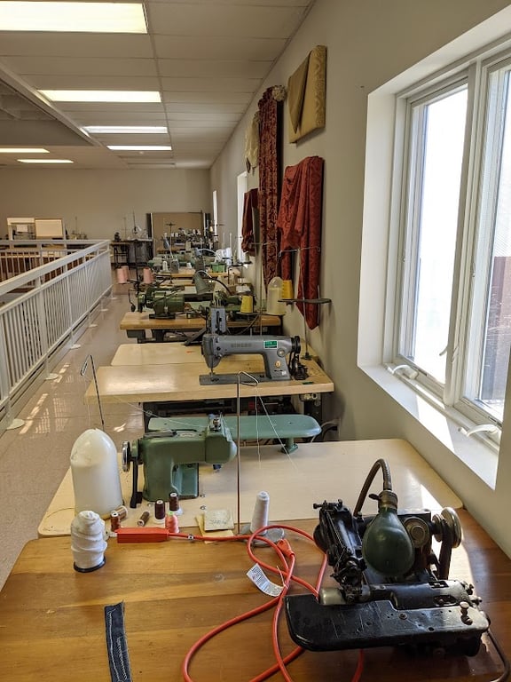 The image shows a well-lit sewing center with multiple sewing machines lined up on wooden tables.