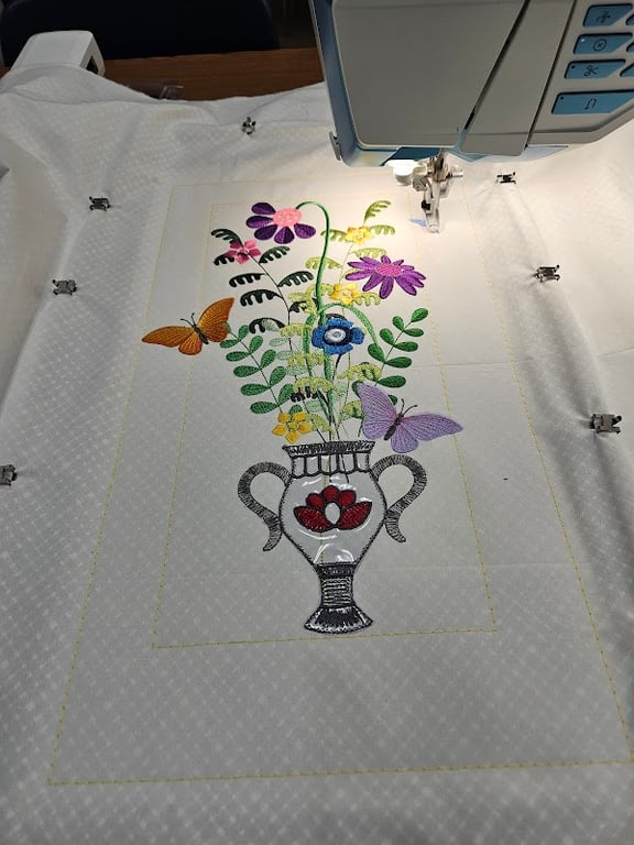 The image shows a sewing machine in action, embroidering a colorful floral design featuring butterflies and a vase on white fabric.