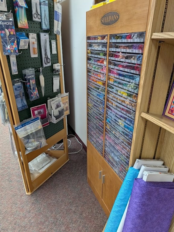 The image shows the interior of Roberts Sewing Center, featuring a wooden display cabinet filled with colorful threads and a pegboard stand showcasing various sewing tools.