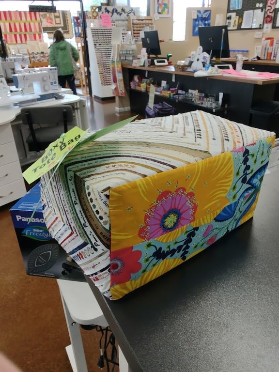 The image shows a colorful sewing machine cover on a display table at Top Shelf Quilts, surrounded by various sewing supplies.