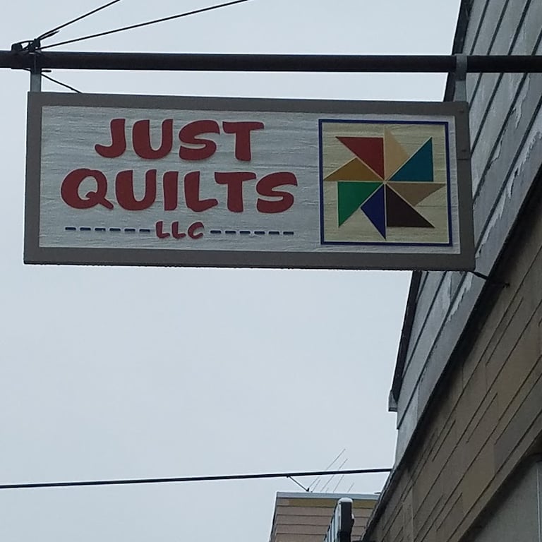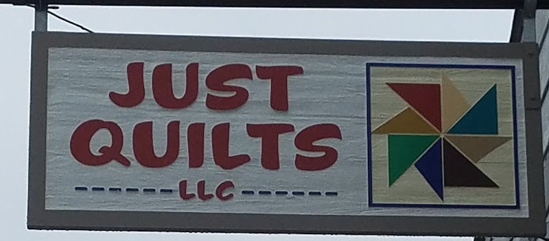 The image features a sign for Just Quilts LLC, showcasing the store's name in bold red letters.