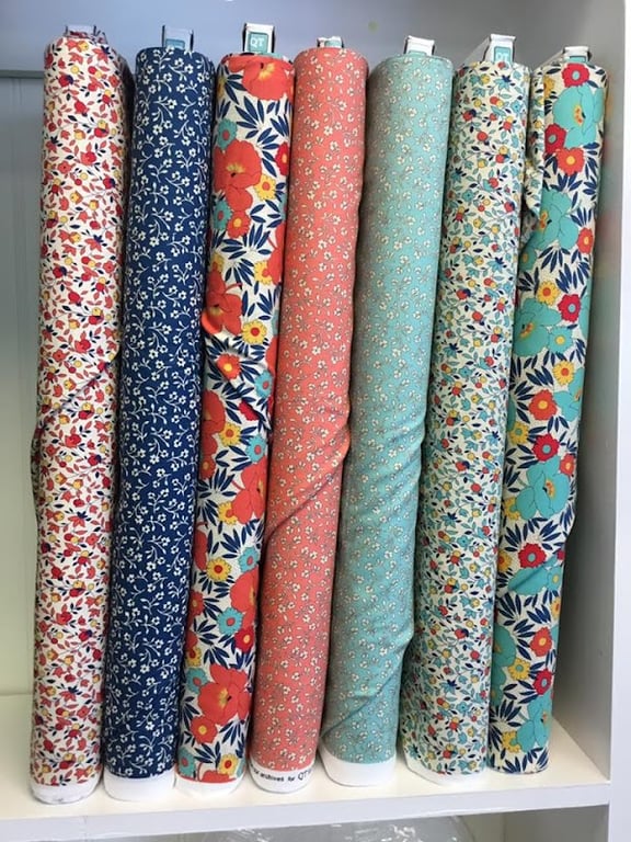 A display of colorful fabric rolls is showcased in Just Quilts LLC, featuring floral and patterned designs.