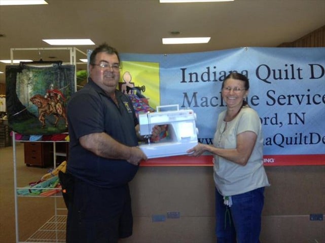 A man and a woman stand in the Indiana Quilt Depot, smiling as they hold a sewing machine. The store features colorful fabrics and quilt displays in a welcoming interior.