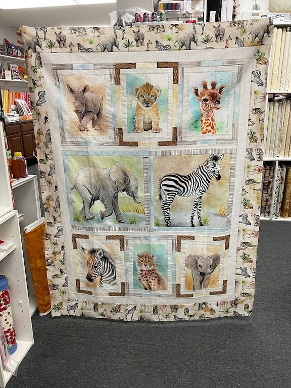 The image showcases a vibrant quilt featuring animal illustrations, including a lion, giraffe, and zebra, displayed in a sewing store.