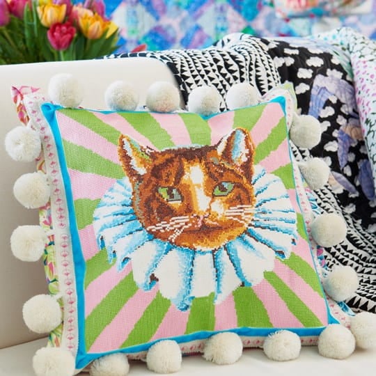 A colorful decorative pillow featuring a cat's face with a ruffled collar sits on a couch, surrounded by vibrant fabrics and a bouquet of tulips in the background.