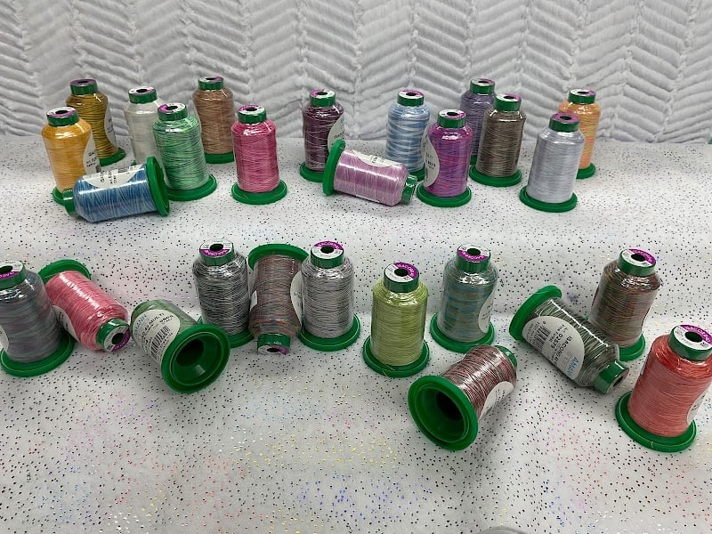 A vibrant display of colorful sewing threads is arranged on a sparkling surface, showcasing various shades and textures.