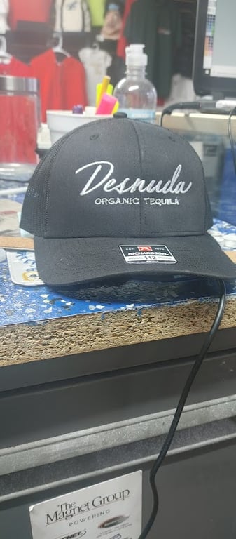A black cap with "Desnuda Organic Tequila" embroidered on it sits on a textured countertop in a sewing store.