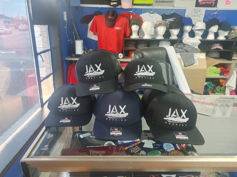 The image shows a display of black caps with "JAX Roofing" printed on them, arranged on a glass counter in a sewing store.