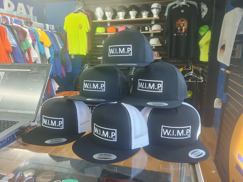 The image features a display of black and white trucker hats with the logo "W.I.M.P." prominently featured.