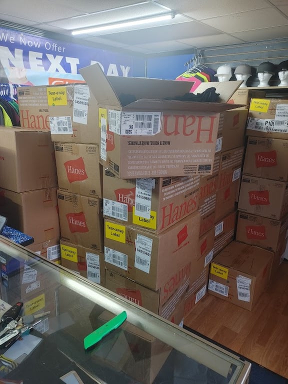 The image shows a sewing store interior filled with stacked boxes of Hanes products, indicating a busy inventory.