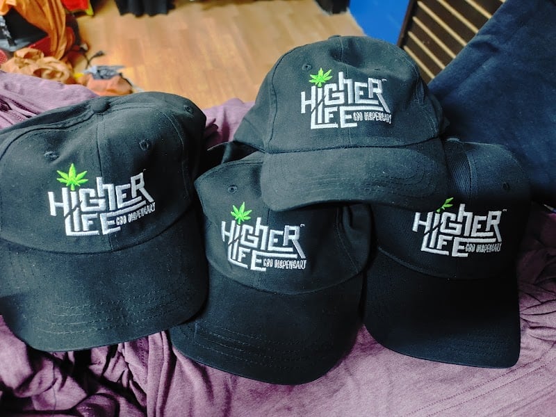 The image features several black baseball caps stacked together, each embroidered with the "Higher Life" logo and a green leaf design.