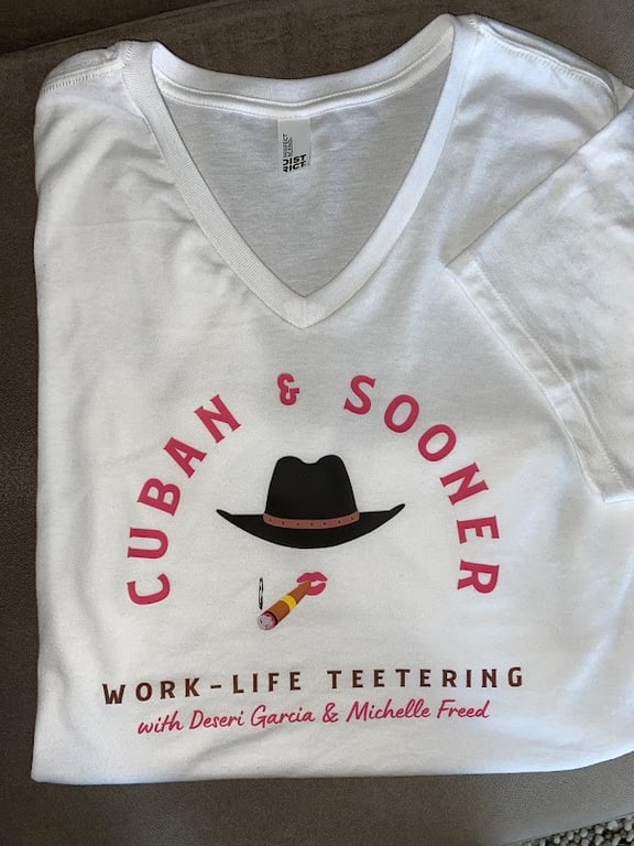 A white V-neck t-shirt displays the text "Cuban & Sooner" with a graphic of a cowboy hat and a sewing needle. The shirt promotes a podcast titled "Work-Life Teetering."